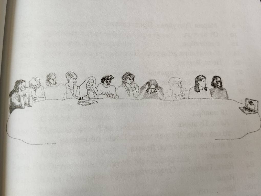 Занятия проходили во временя пандемии, поэтому учитель с учениками часто общался удаленно, по зуму, и записи сохранились, потом стенаграфировались бабушкой одного из студентов и вот в результате - вышла книга. Очень любопытная. 1500 экземпляров, не много, но и не мало.